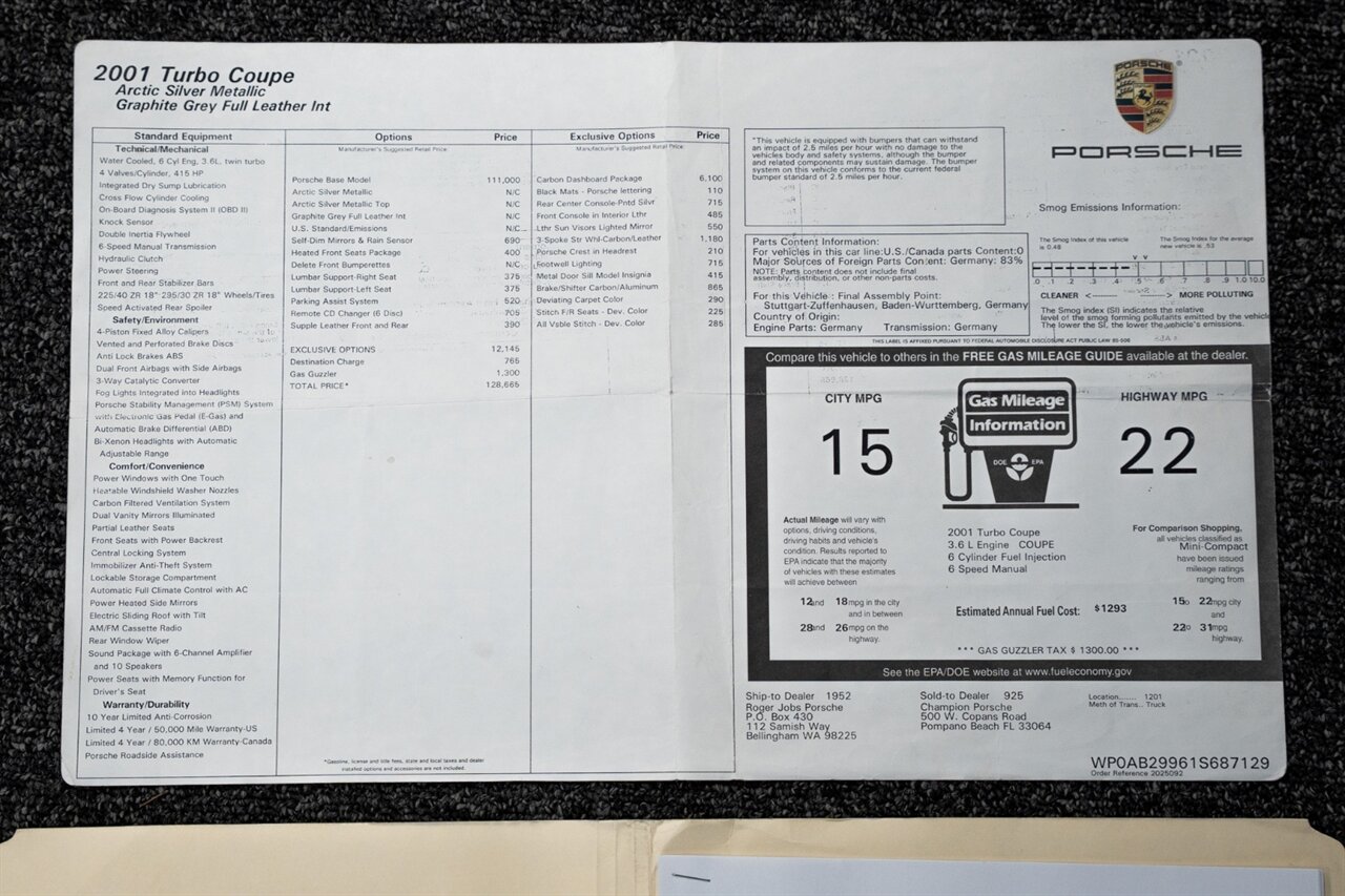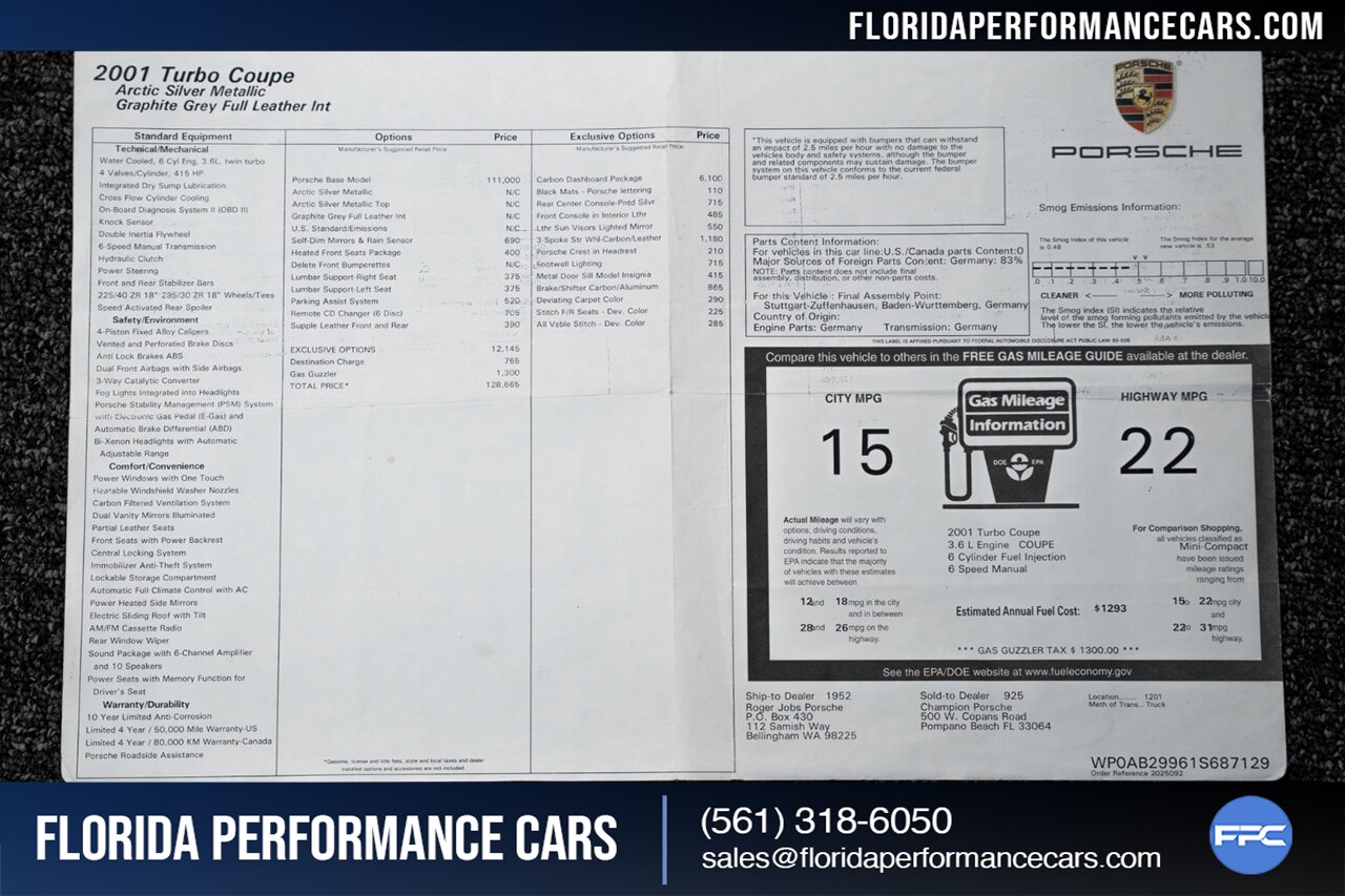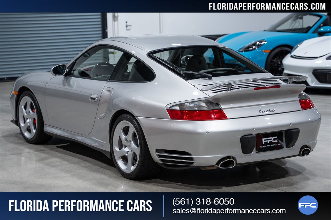 Florida Performance Cars is pleased to announce the arrival of this STUNNING 2001 Porsche 911 Turbo finished in Arctic Silver Metallic over Graphite Grey Full Leather Interior w/ 6-Speed Manual transmission and ONLY 16,189 miles!! This is a Clean CARFAX, pristine condition and very well appointed 996 Turbo Coupe.