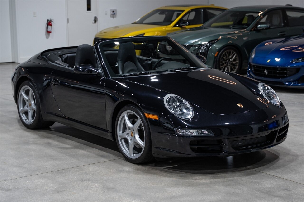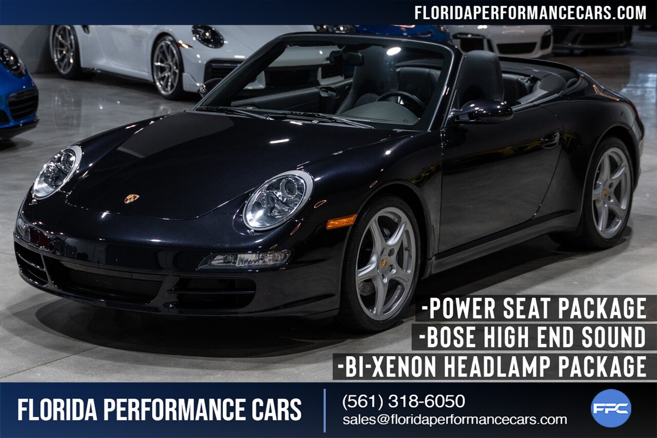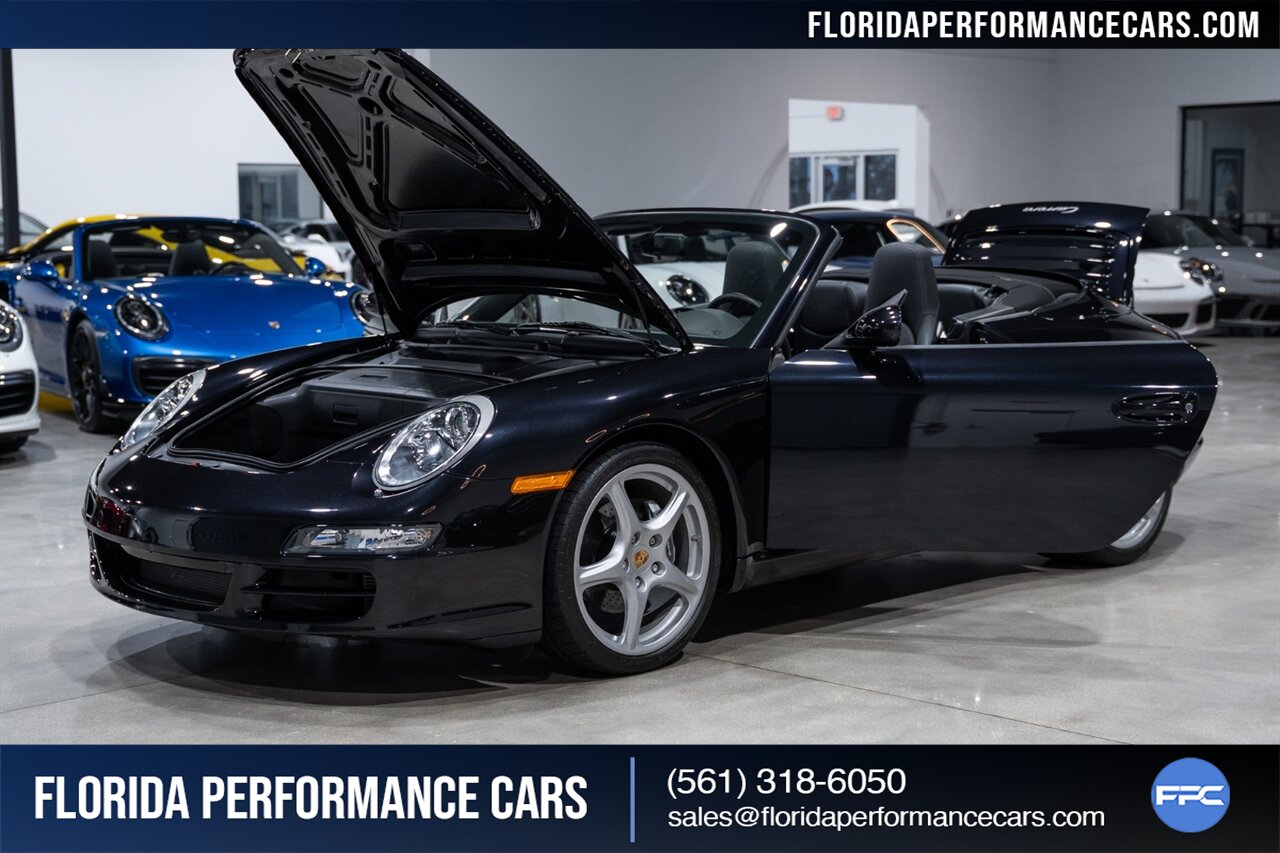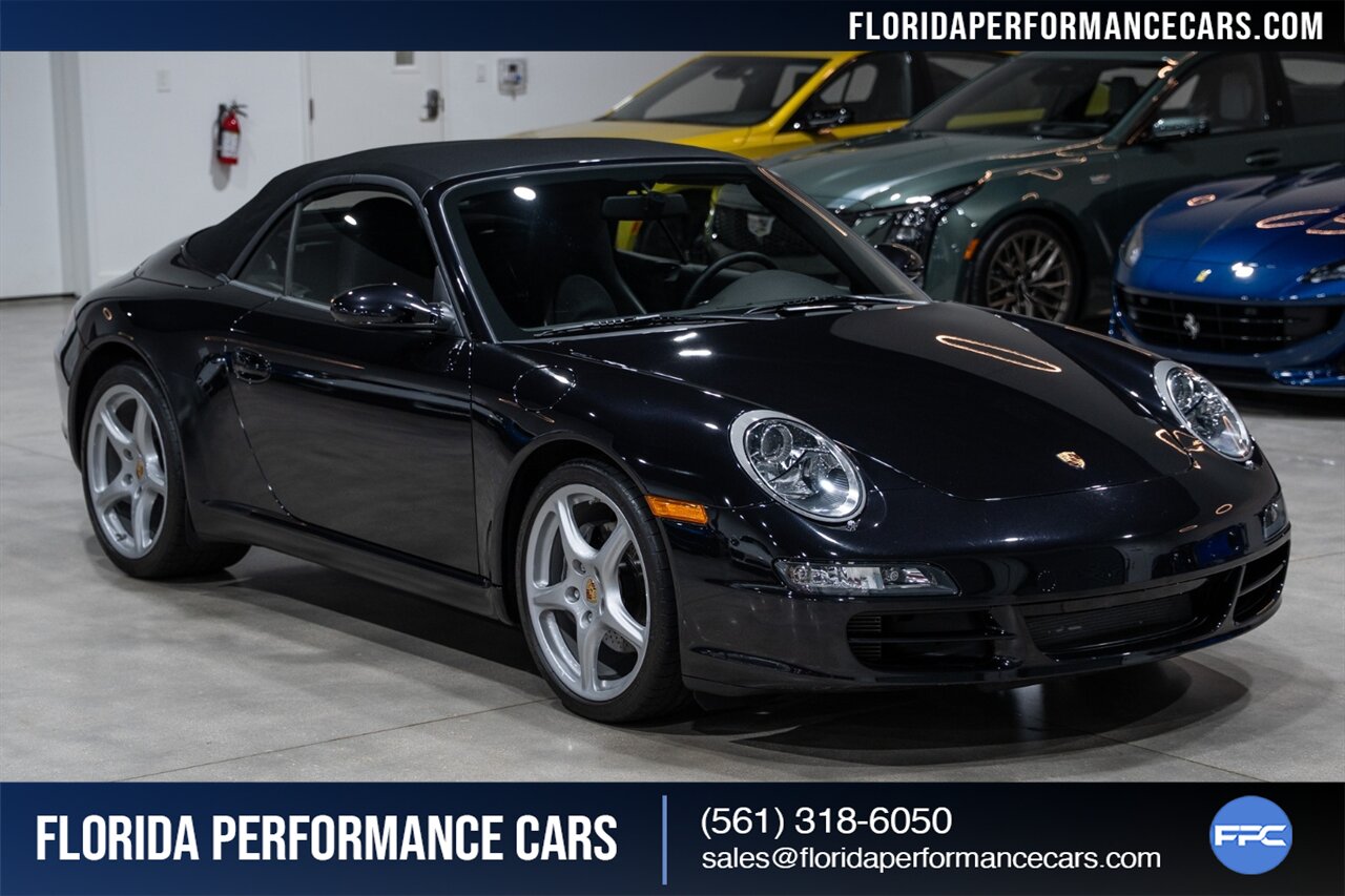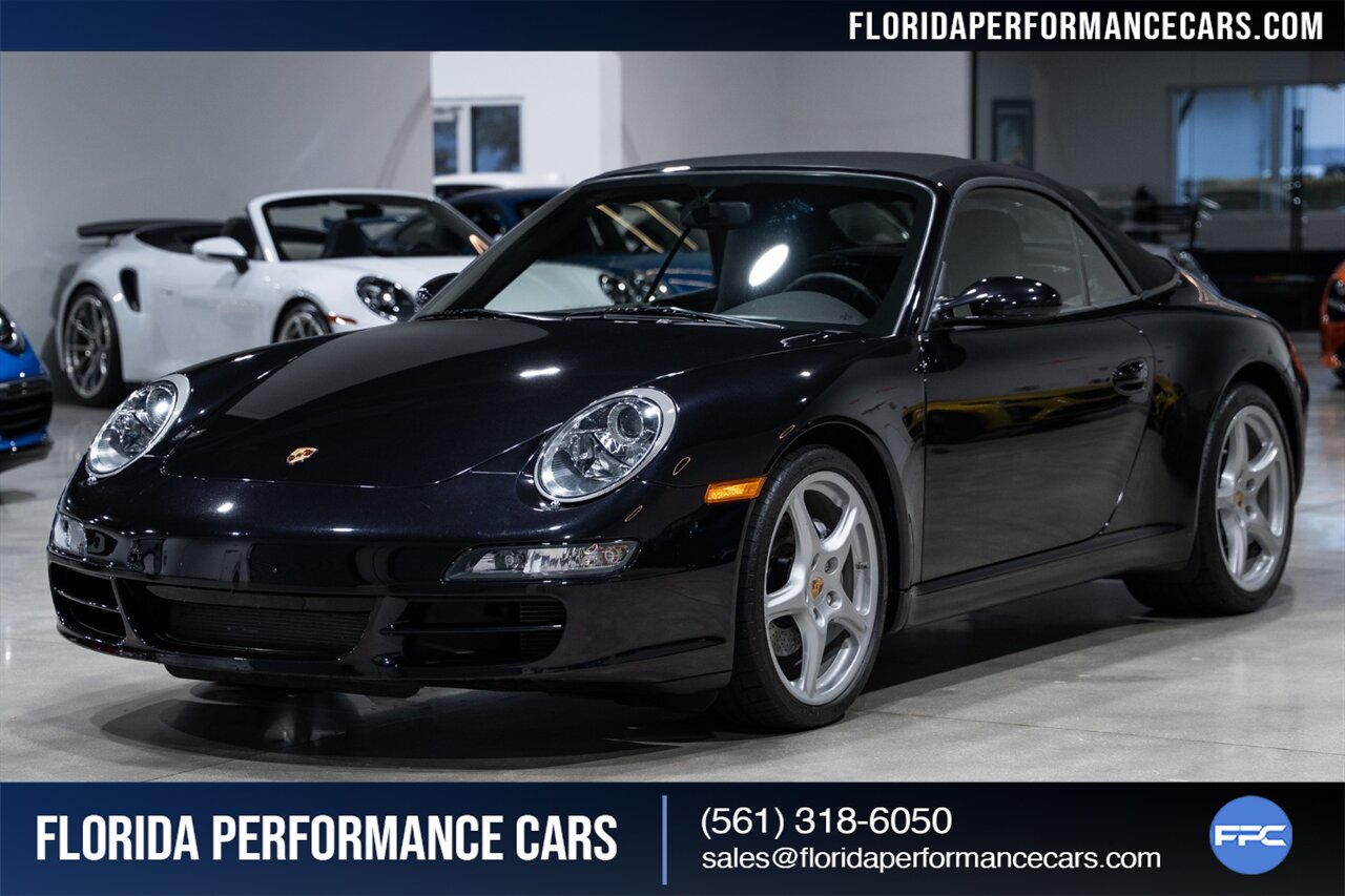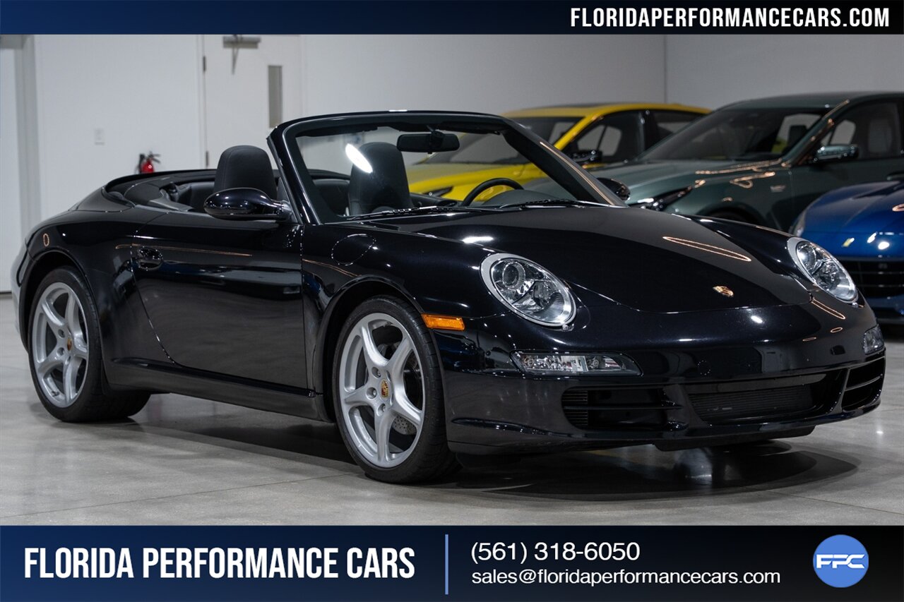 Florida Performance Cars is pleased to announce the arrival of this STUNNING 2007 Porsche 911 Carrera Cabriolet finished in Basalt Black Metallic over Black interior w/ ONLY 10,566 miles!! This is a Clean CARFAX, pristine condition and exceptionally well-kept 997 Carrera cab.