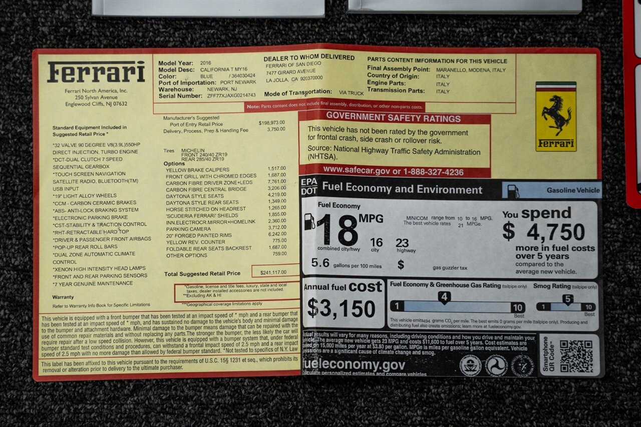 Florida Performance Cars is pleased to announce the arrival of this STUNNING 2016 Ferrari California T finished in Blu Tour de France Metallic over Beige Tradizione interior w/ Daytona Style seats and ONLY 14,619 miles! This is a Clean CARFAX, excellent condition and exceptionally well optioned California T.