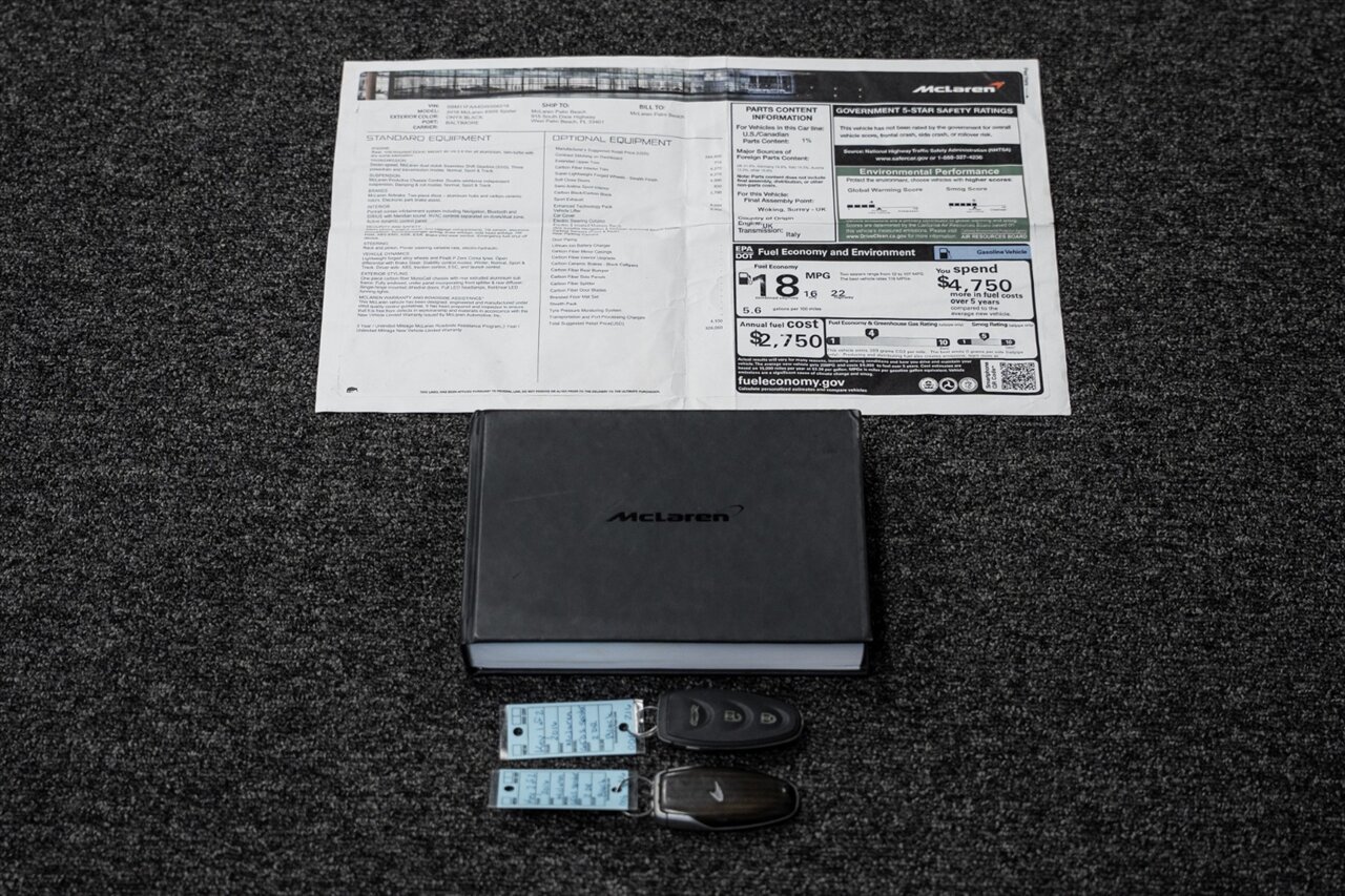 All Original, TONS of carbon inside and out, HUGE $326,090 Original MSRP!! Only 2 long-term owners since new, garage Kept, just serviced and the entire front is wrapped in clear protection film (PPF). 2 keys, Books, battery tender, car cover and the original McLaren window sticker will come with the car to the next owner.