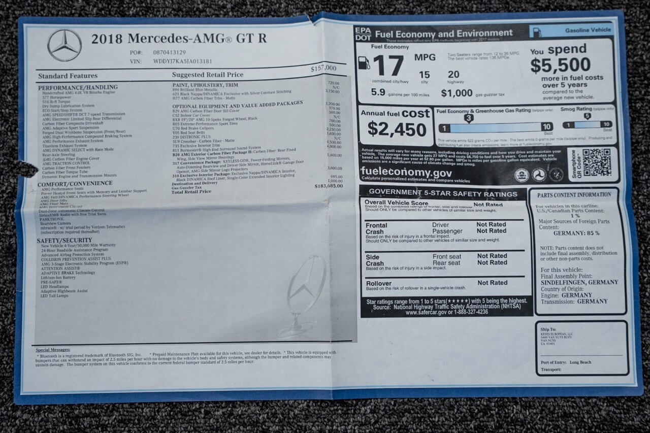 This is a Clean CARFAX, pristine condition and exceptionally well optioned AMG GT R. All original, garage kept, non-smoker interior. Good service history at Mercedes, tires are very good Michelin Pilot Sport Cup 2 all around. 2 keys, owners manuals and the original window sticker will all come with the car to the next owner. An overall very top tier and well-kept example.