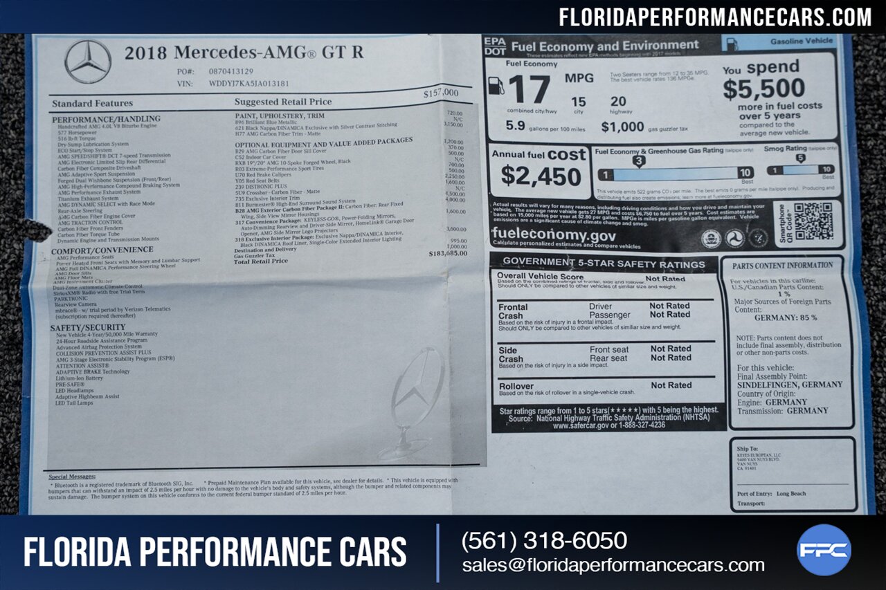 Florida Performance Cars is pleased to announce the arrival of this STUNNING 2018 Mercedes-Benz AMG GT R finished in BRILLIANT BLUE METALLIC over Black w/ Exclusive Leather Upholstery w/ Silver stitching and ONLY 12,260 miles!