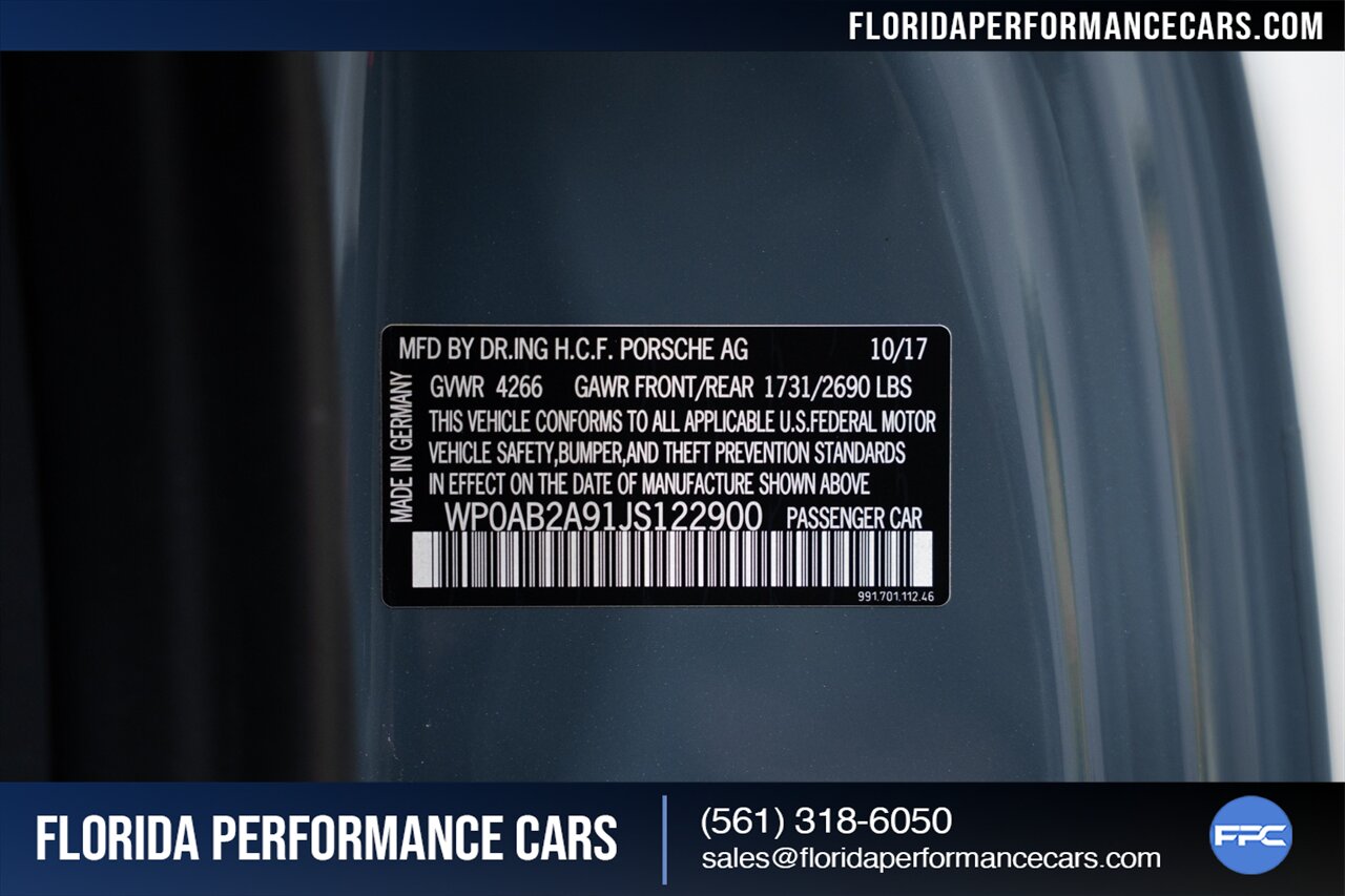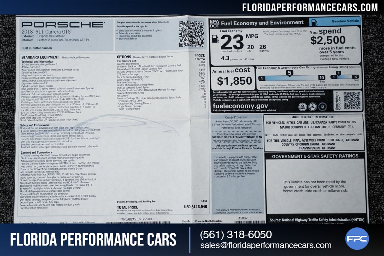 Florida Performance Cars is pleased to announce the arrival of this STUNNING 2018 Porsche 911 Carrera GTS finished in Graphite Blue Metallic over Leather/Alcantara Interior in Black/Carmine Red w/ GTS Interior Package and 51,165 miles. This is a Clean CARFAX, excellent condition and exceptionally well kept 911/991.2 GTS Coupe.