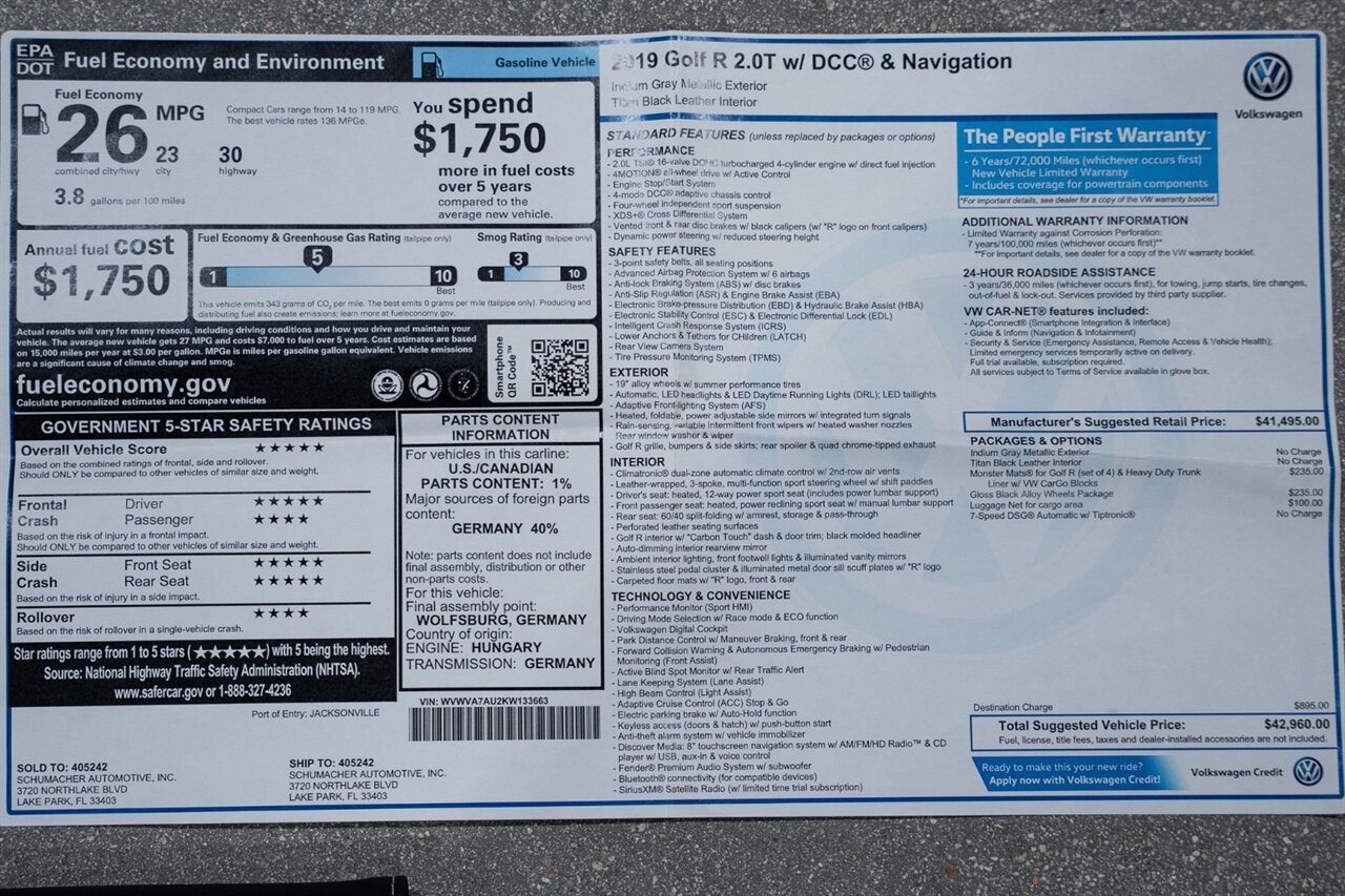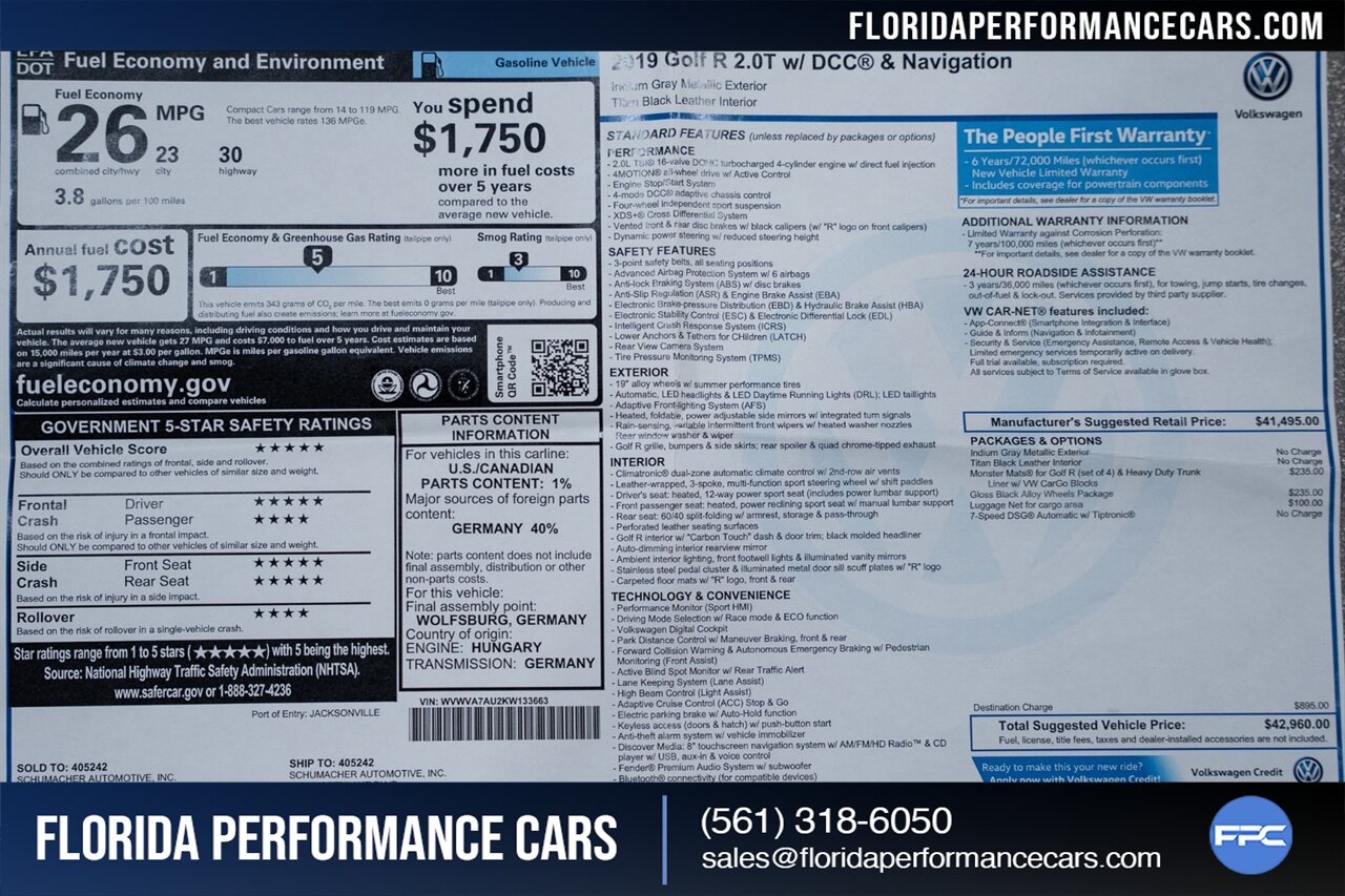 This Golf R features many tastefully selected upgrades! Local Florida owned since new, garage kept, non-smoker interior. Upgraded DBV2 IS38 Hybrid Turbo with dyno proven 409hp / 383tq, brand new Continental Extreme Contact Sport 02 tires, and over $20k in upgrades! 2 keys, owners manual, window sticker, and all weather floor mats will come with the car to the next owner.