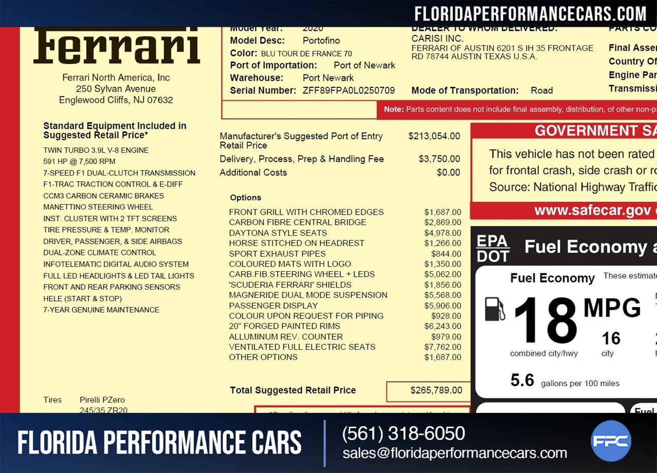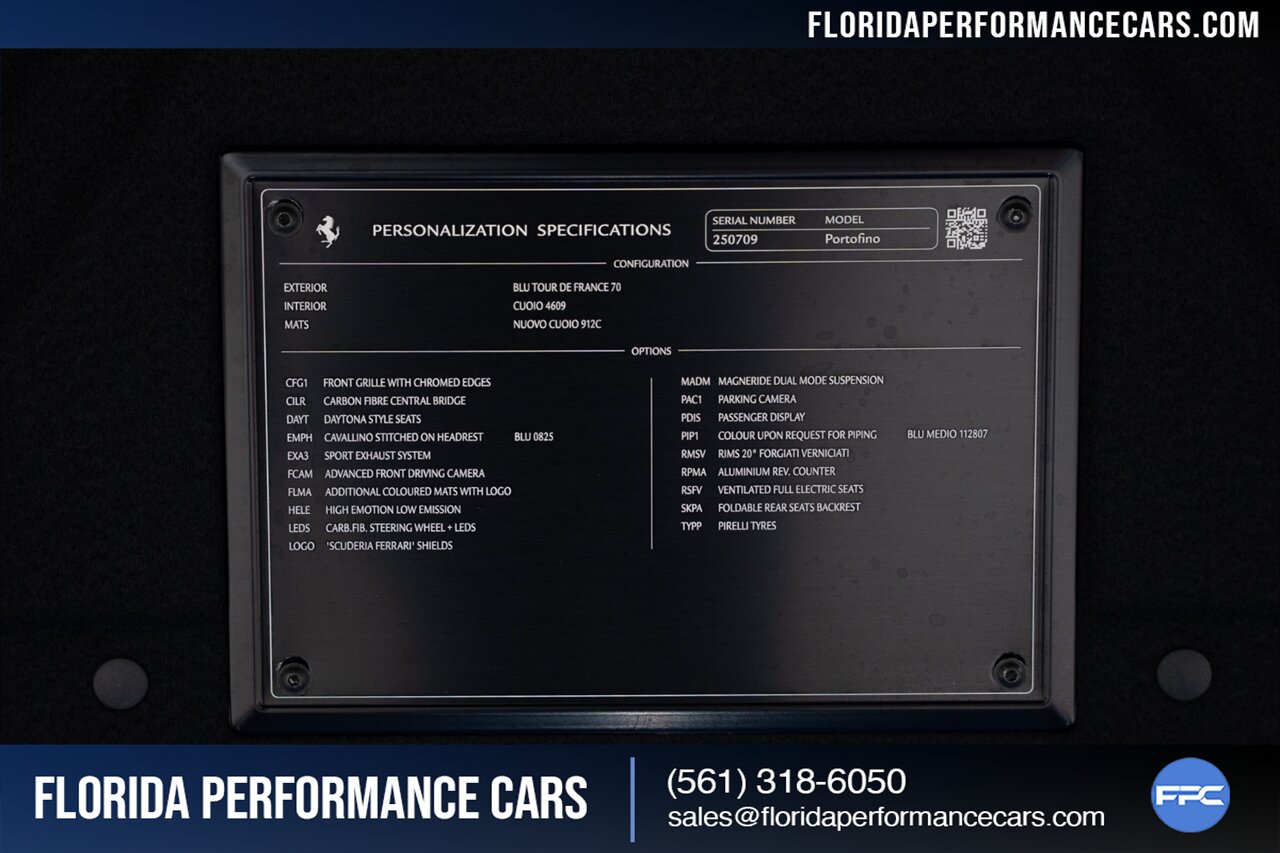 Florida Performance Cars is pleased to announce the arrival of this STUNNING 2020 Ferrari Portofino finished in Blu Tour De France (TDF Blu) over Cuoio interior w/ 24,855 miles. This is a Clean CARFAX, excellent condition and EXCEPTIONALLY well optioned Portofino.