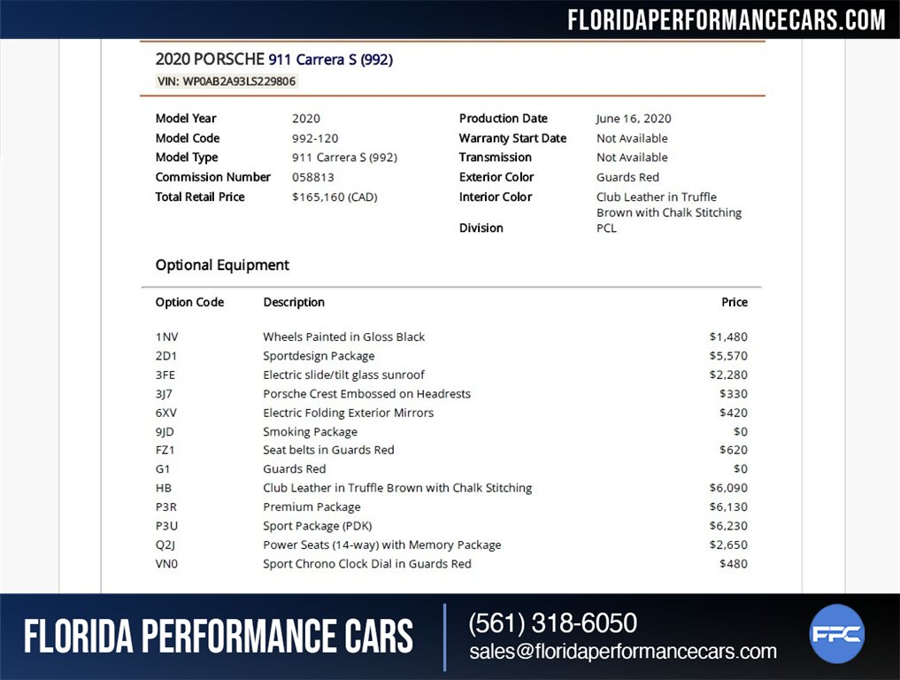 Florida Performance Cars is pleased to announce the arrival of this STUNNING 2020 Porsche 911 Carrera S finished in Guards Red over Club Leather in Truffle Brown w/ Chalk Stitching and Only 11,131 miles! This is a Clean CARFAX, pristine condition and EXCEPTIONALLY well optioned 992 Carrera S Coupe. Garage kept, non-smoker, Front clear-bra (PPF), Pirelli P Zero tires all around. Service just completed. 2 keys, Owners manuals and a Porsche battery tender will come with the car to the next owner.