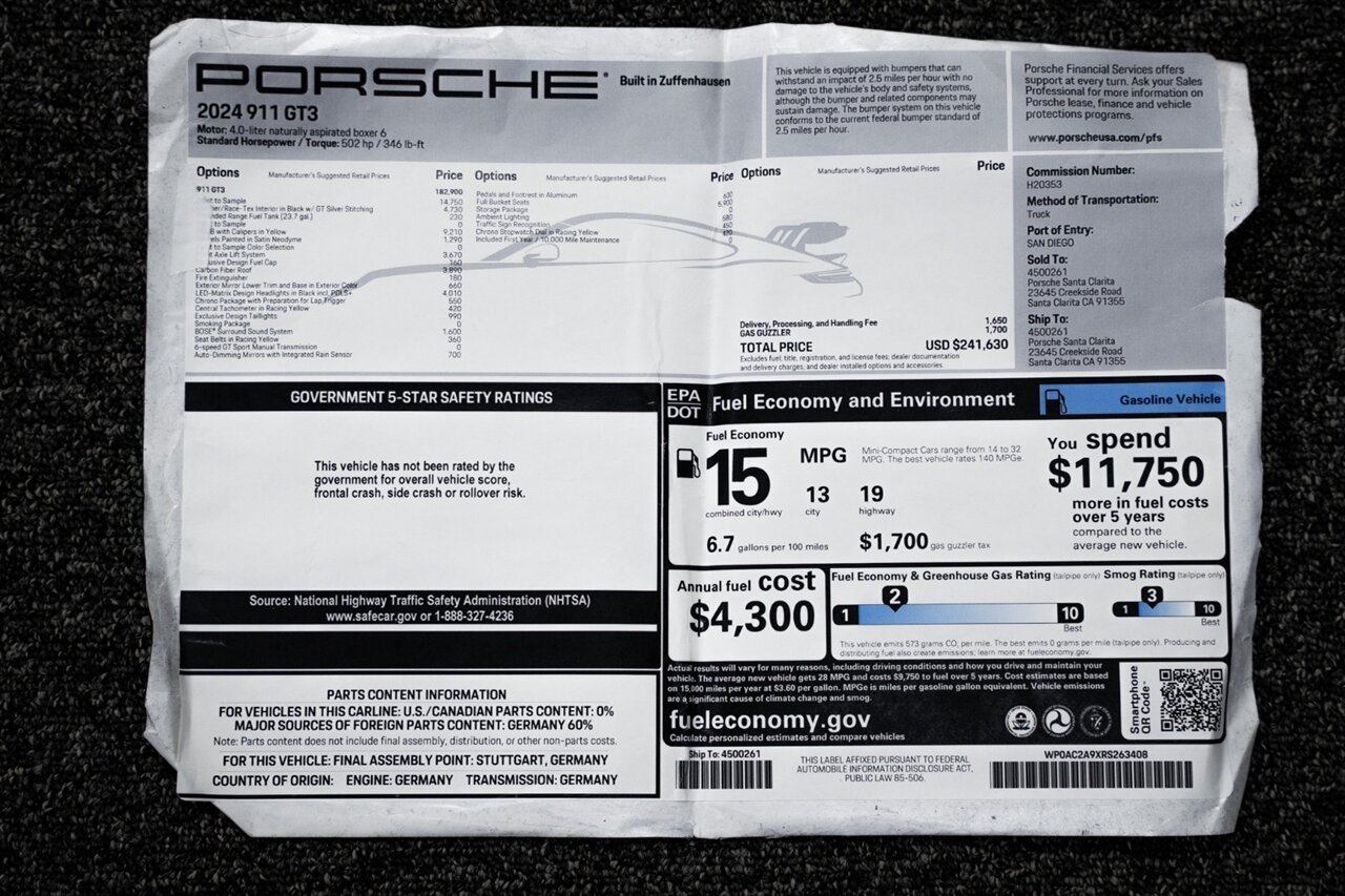 This is a 1-Owner, Clean CARFAX and EXCEPTIONALLY well optioned PTS 992 GT3 6-Speed. The car is all original, fully wrapped in clear-bra (PPF), no mods, and still essentially brand new.
