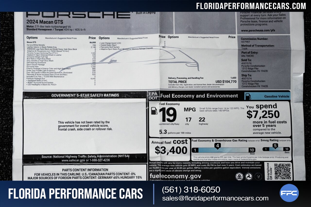 This is a Clean CARFAX, excellent condition and EXCEPTIONALLY well optioned Macan GTS. Local Florida trade, garage kept, non-smoker interior. Front bumper clear bra, good Michelin Pilot Sport tires all around. 2 keys, owners manuals and the original Porsche window sticker will all come with the car to the next owner.